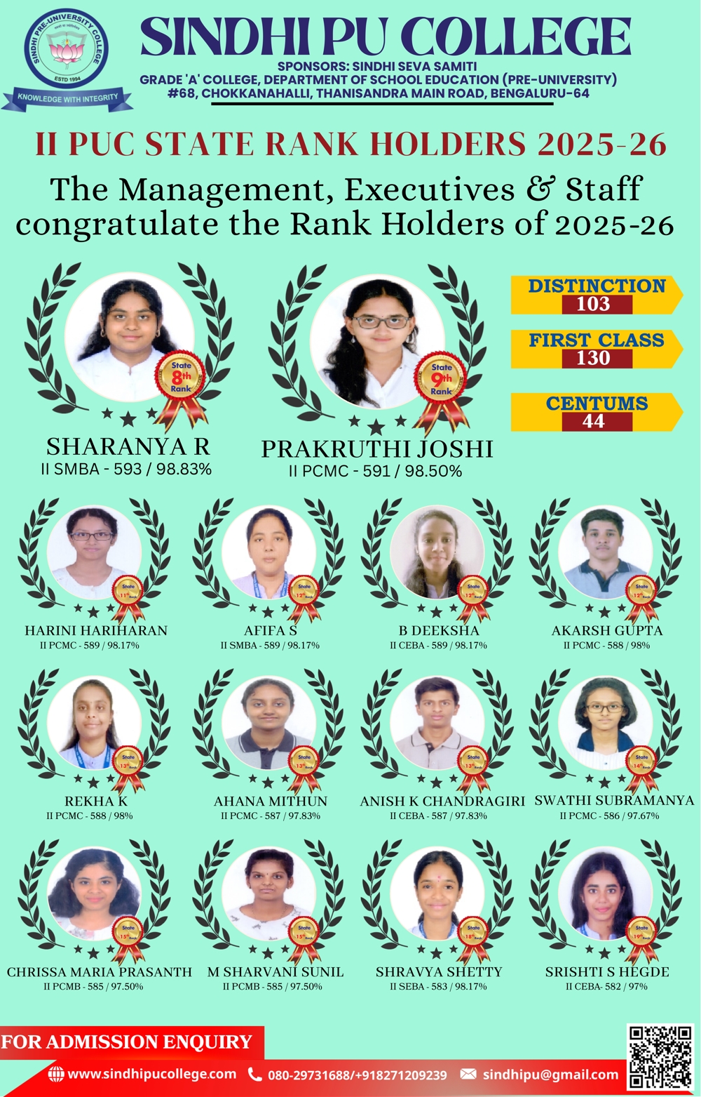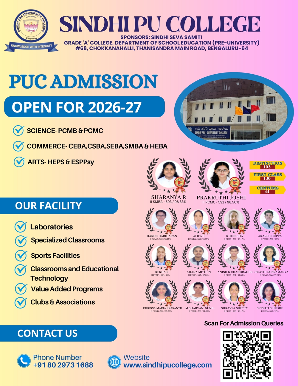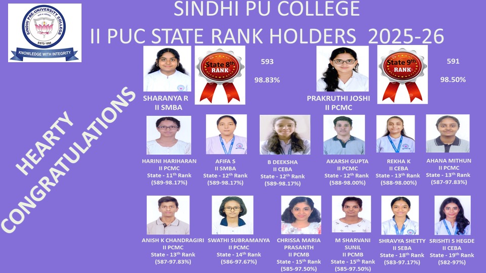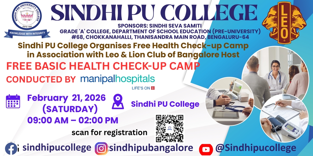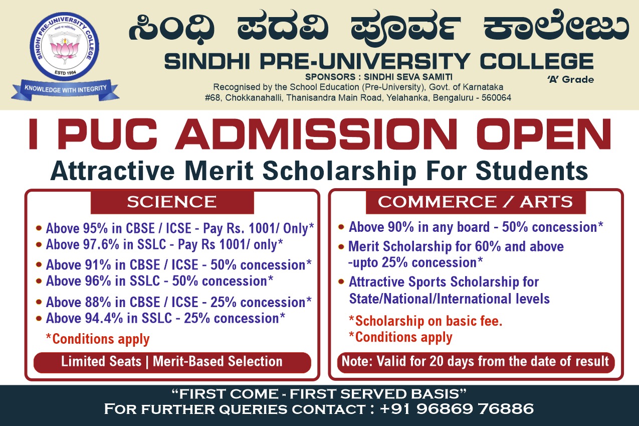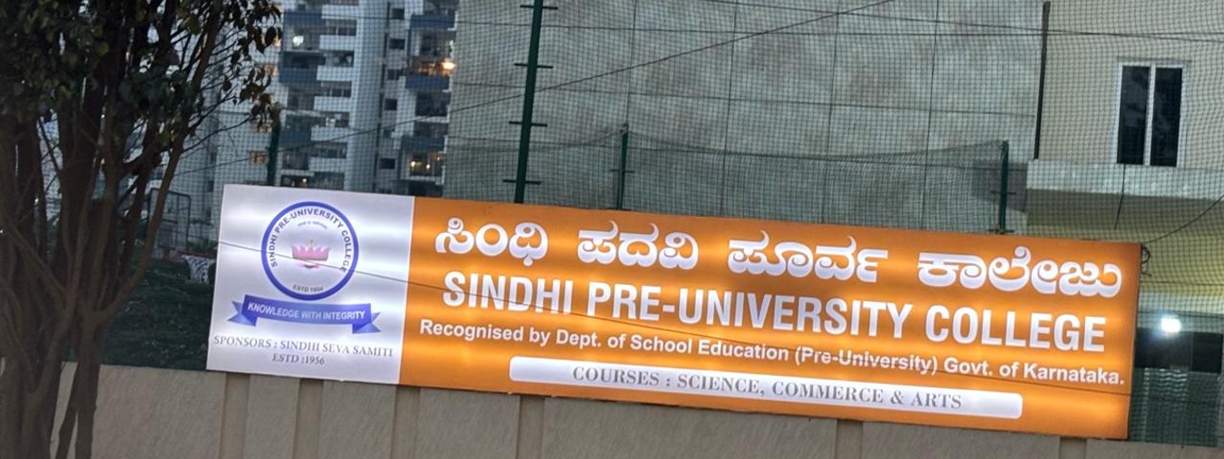 Sindhi PU College is one of the oldest PU Colleges in Bangalore established in the year 1994. With a total student strength of 1600 it is also one of the largest colleges affiliated to the Department of Pre-university Education, Karnataka. It is basically unaided Private Institution which has a great reputation for quality education at affordable cost. The campus has an ambience of multi-cultural student communities. It is also an educational platform where several strata of society of this locality. The college promotes excellence required for the globalised world but firmly rooted in Indian.