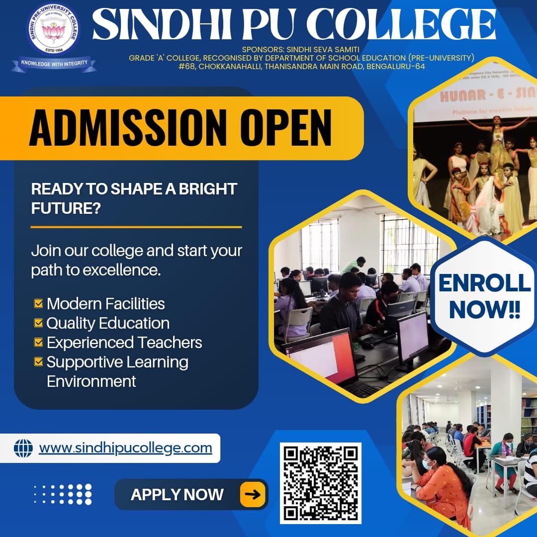 Established in 1994, Sindhi PU College is one of Bengaluru’s oldest and most distinguished pre-university institutions. For over three decades, the College has been a benchmark of academic integrity and holistic development in the city. With a student strength of 700 in the preceding academic year, it is recognised as one of the largest institutions affiliated with the Department of School Education ( Pre- University) , Government of Karnataka.